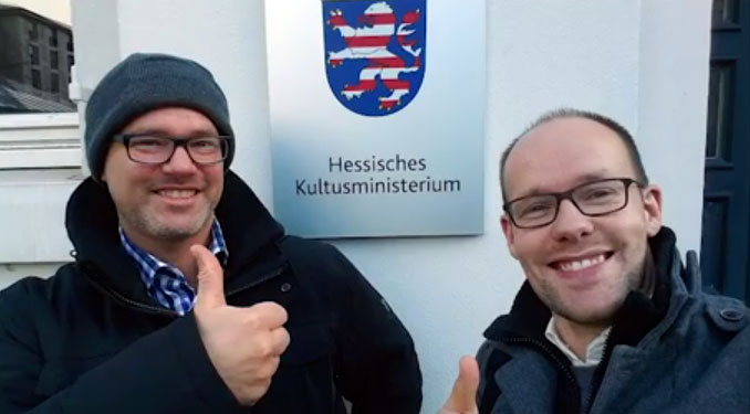 Florian Bagus und Norman Seeliger waren für den Projektstart von „Medienindustrie 4.0“ Ende Oktober 2018 im Hessischen Kultusministerium. Sie entwickeln dort zunächst eine exemplarische Unterrichtssituation. Danach startet eine langfristig geplante Reihe für die HLFT um weitere Lehrkräfte auszubilden.