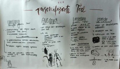 Abschließend durften alle Schülerinnen und Schüler in einer kleinen Diskussionsrunde ihre eigene Sicht über die Aktualität des Themas zum Besten geben. Ganz nach dem Motto „sind wir nicht alle ein bisschen abergläubisch?“ kamen Vorstellungen zum Vorschein, die Menschen seit langer Zeit beschäftigen und im heutigen Bewusstsein präsent sind, z.B. „man muss das Fenster öffnen, um die Seele rauszulassen“ oder „niemals würde ich ein Haus auf einem ehemaligen Friedhof errichten“.