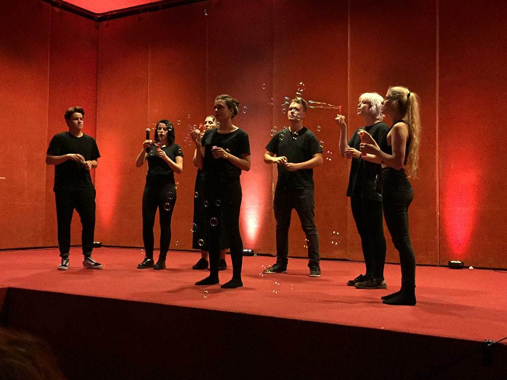 Im weiteren Verlauf des Abends wurden die Gäste durch verschiedene Darbietungen und Impressionen der Abschlussklassen unterhalten. Besonderen Anklang fand das darstellende Spiel von Schülerinnen und Schüler aus der Fachoberschule, welche unter der Regie von Nina Bueltemeier das Thema „Was soll aus dir werden ?!“ eindrucksvoll inszeniert haben. Mit Elementen aus E. T. A. Hoffmanns „Der Sandmann“ und „Top Dogs“ von Urs Widmer wurde den Zuschauern ein überraschender und nachdenklich stimmender Ausblick auf die Zukunft geboten.
